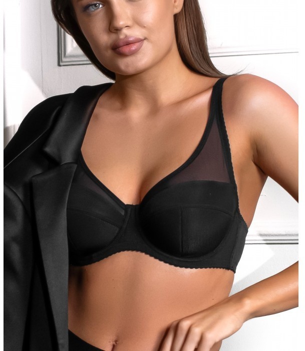 Бюстгальтер из эластичного трикотажного полотна и эластичной сетки, на каркасах. Стан и чашки из микрофибры. Боковые детали стана укреплены упругими пластинами. Чашки с тройным членением. Верхняя деталь чашки из 2-х частей: эластичной сетки и м/ф. Нижние детали чашки на дубляже с хлопком, втачаны в стан. Бюстгальтер застёгивается сзади на крючки и петли.